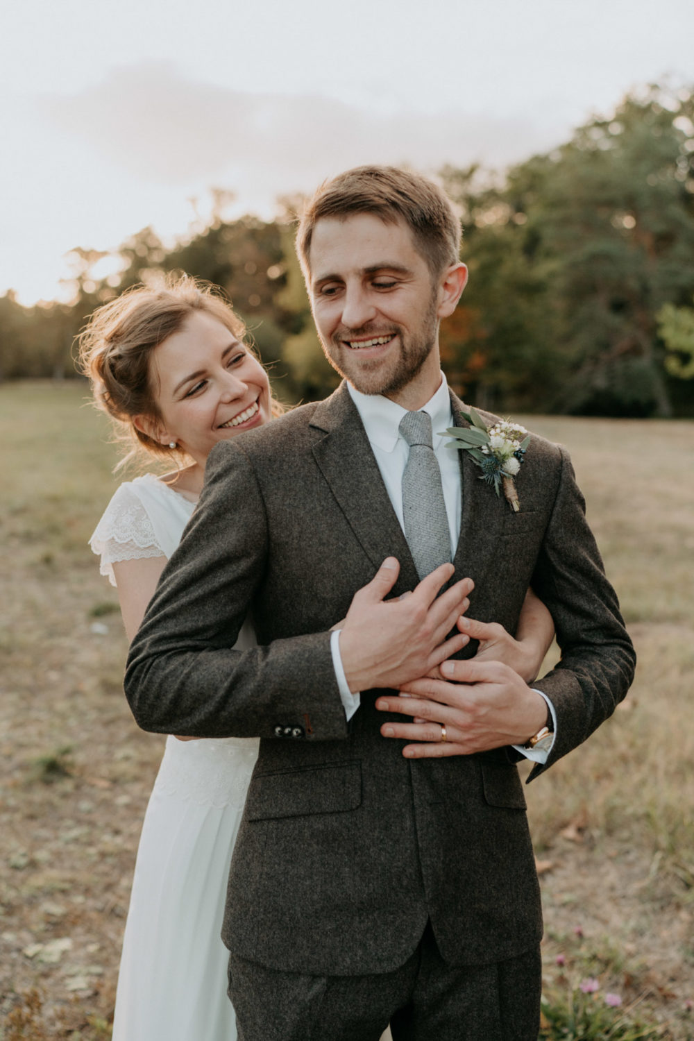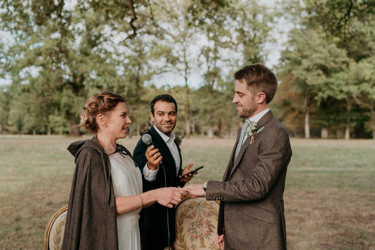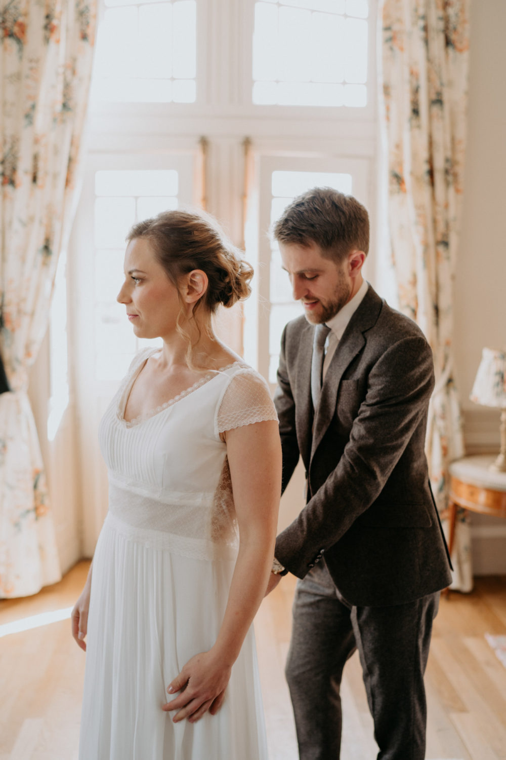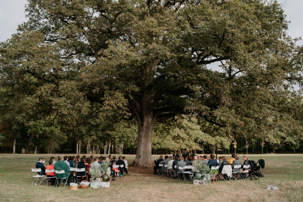 Leur préparation en début d'après midi nous as tous mis dans le bain : pas de chichis, beaucoup de rire et encore plus d'impatience ! Le marié qui habille la mariée, on aime non ? Pourquoi forcément être séparés à ce moment du Jour J ? J'ai tout simplement adoré cet instant de complicité entre eux deux. Ce que j'ai tout de suite aimé chez C&B c'est leur naturel et leur envie de casser les codes ! Et c'est ce qu'ils ont fait avec leur cérémonie laïque en pleine nature sous un arbre magnifique. La cérémonie commence par un conte retraçant leur histoire et reflétant l'ambiance "forêt" & mystique de la journée. Que j'aime découvrir l'histoire du couple pendant les cérémonies laïques, je capte les émotions qui découlent de ses souvenirs, les rires et les larmes qui s'en suivent. Et parfois (souvent) je suis tout aussi émue il faut bien le dire !