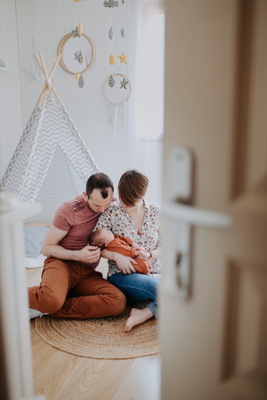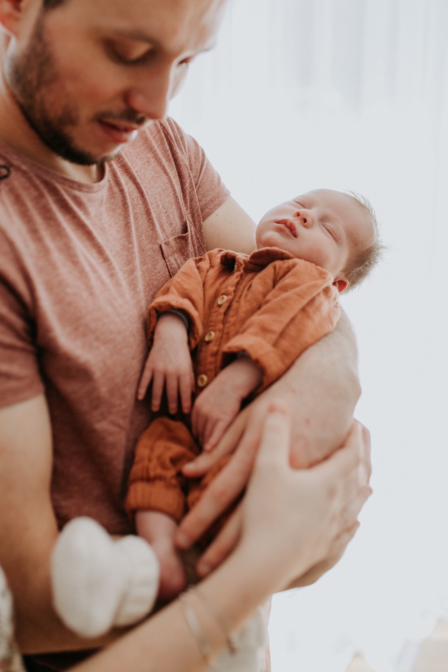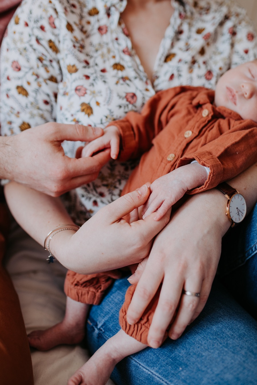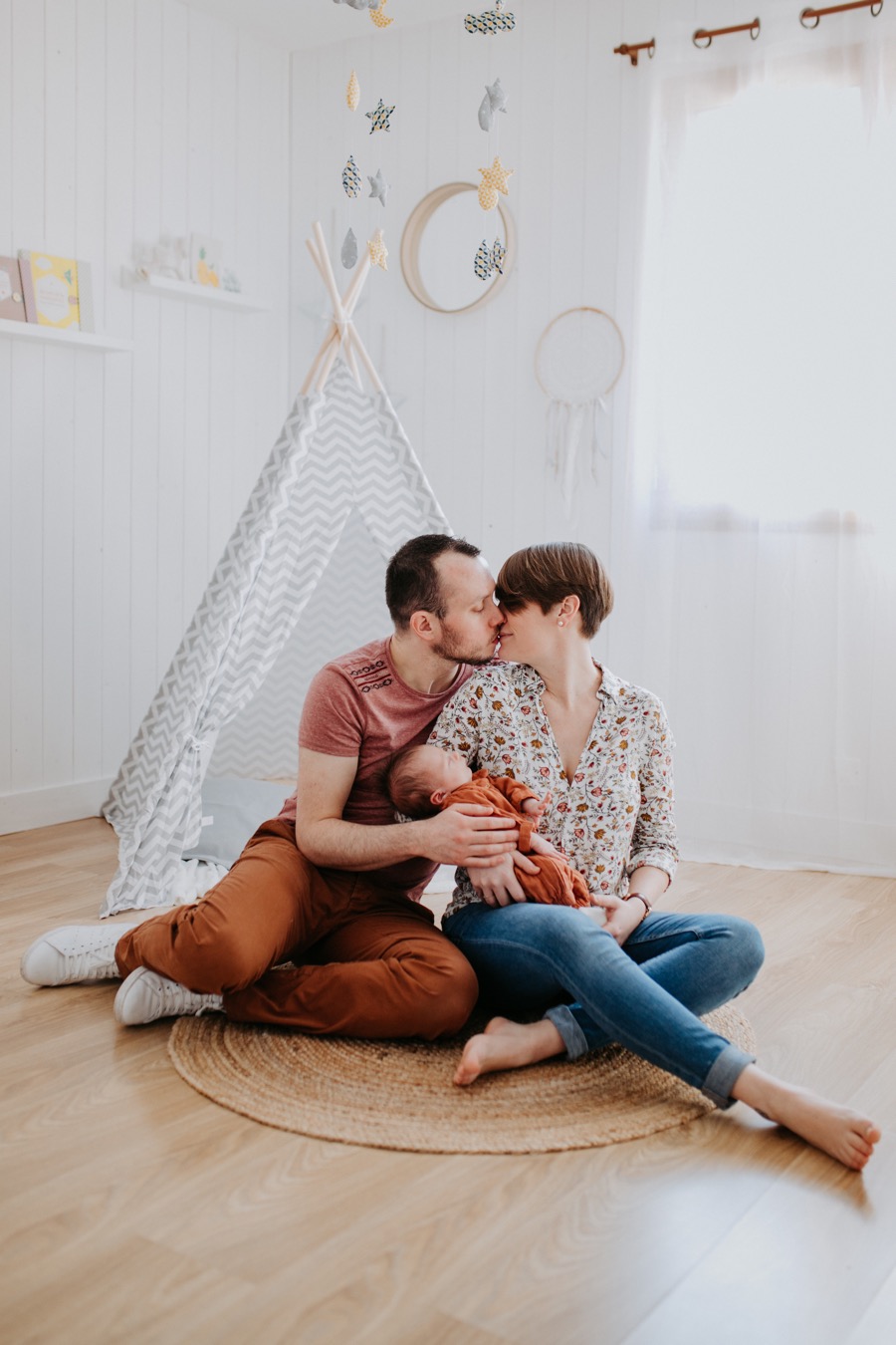 Contrairement aux photos de grossesse, toutes les séances naissances se font à l'intérieur, N'ayant pas de studio photo, je me déplace au domicile des parents. C'est donc chez eux, que j'ai eu le plaisir de trouver C&J et de rencontrer leur adorable petit garçon ! Une séance photo chaleureuse et toute en douceur. Encore une fois, tous les détails étaient soignés pour une jolie harmonie. Et en prime, on a terminé les photos avec les t-shirt canons signés Émoi Émoi !
