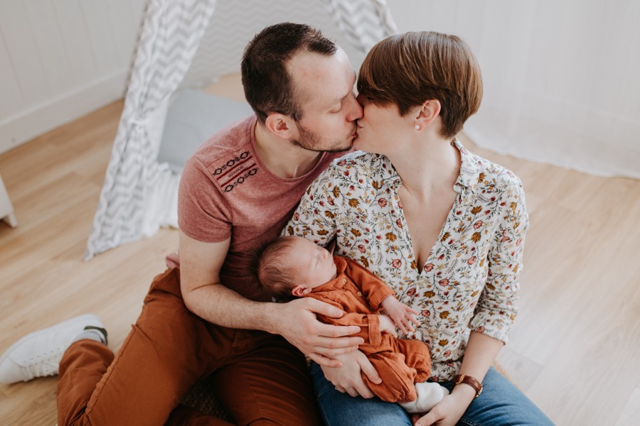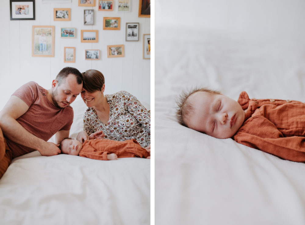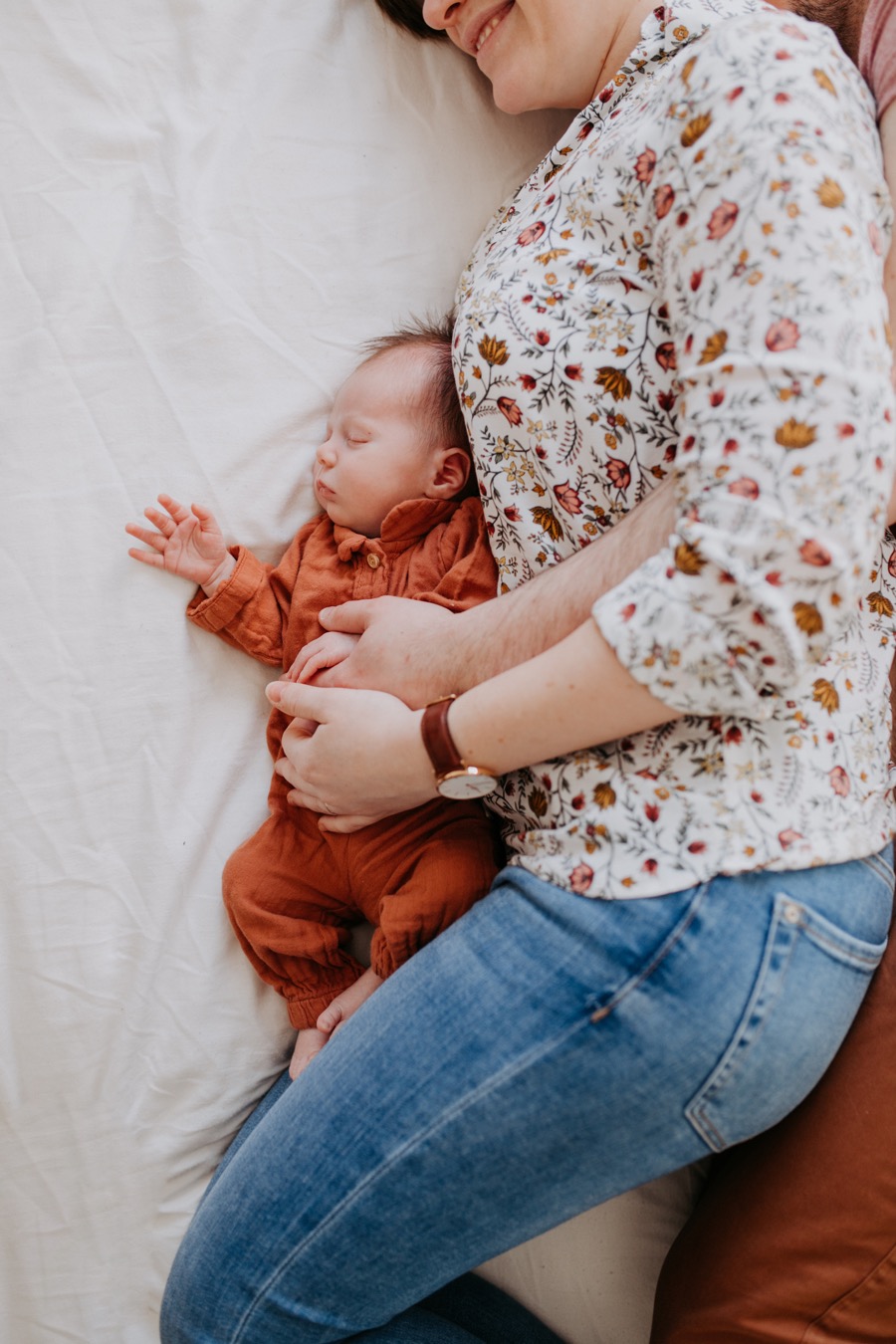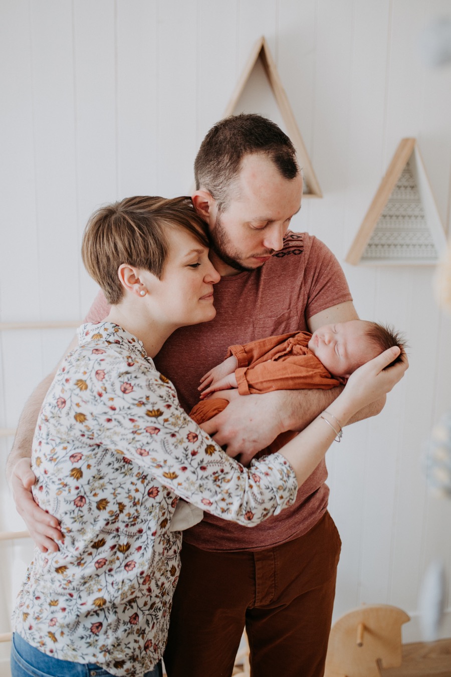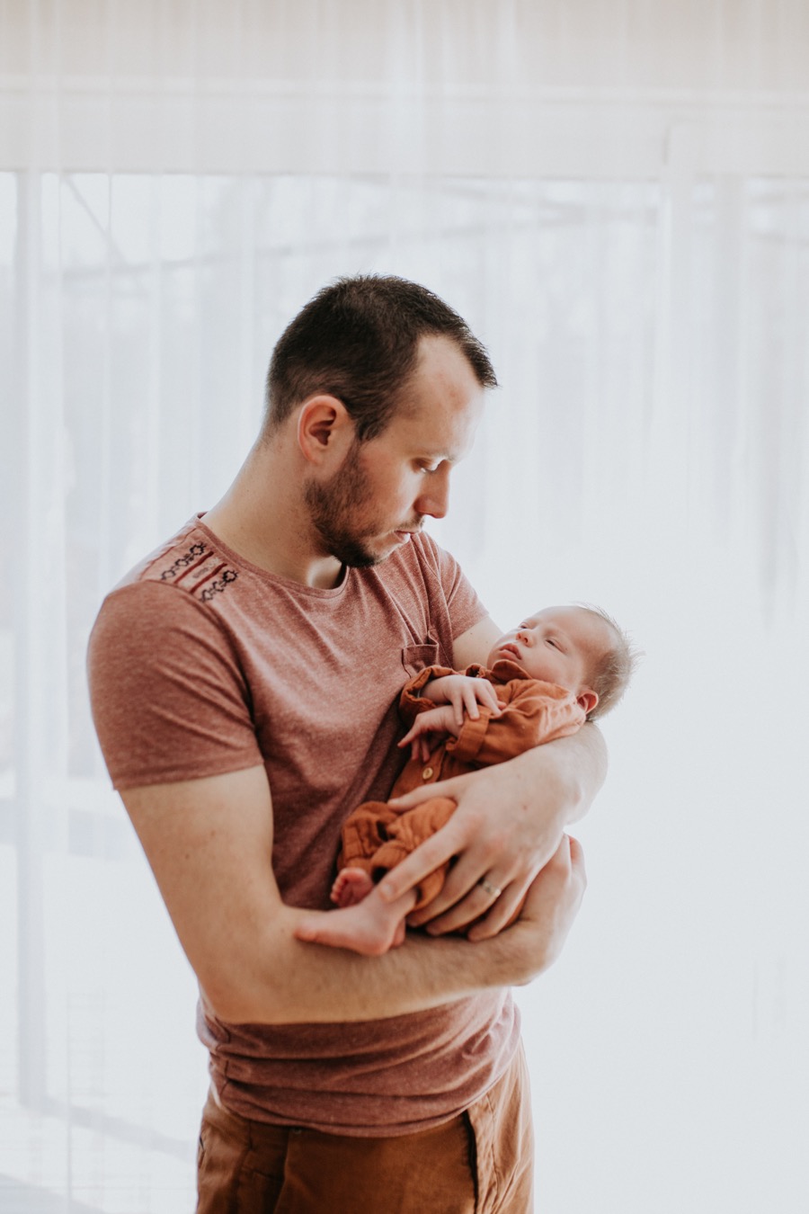 Contrairement aux photos de grossesse, toutes les séances naissances se font à l'intérieur, N'ayant pas de studio photo, je me déplace au domicile des parents. C'est donc chez eux, que j'ai eu le plaisir de trouver C&J et de rencontrer leur adorable petit garçon ! Une séance photo chaleureuse et toute en douceur. Encore une fois, tous les détails étaient soignés pour une jolie harmonie. Et en prime, on a terminé les photos avec les t-shirt canons signés Émoi Émoi !