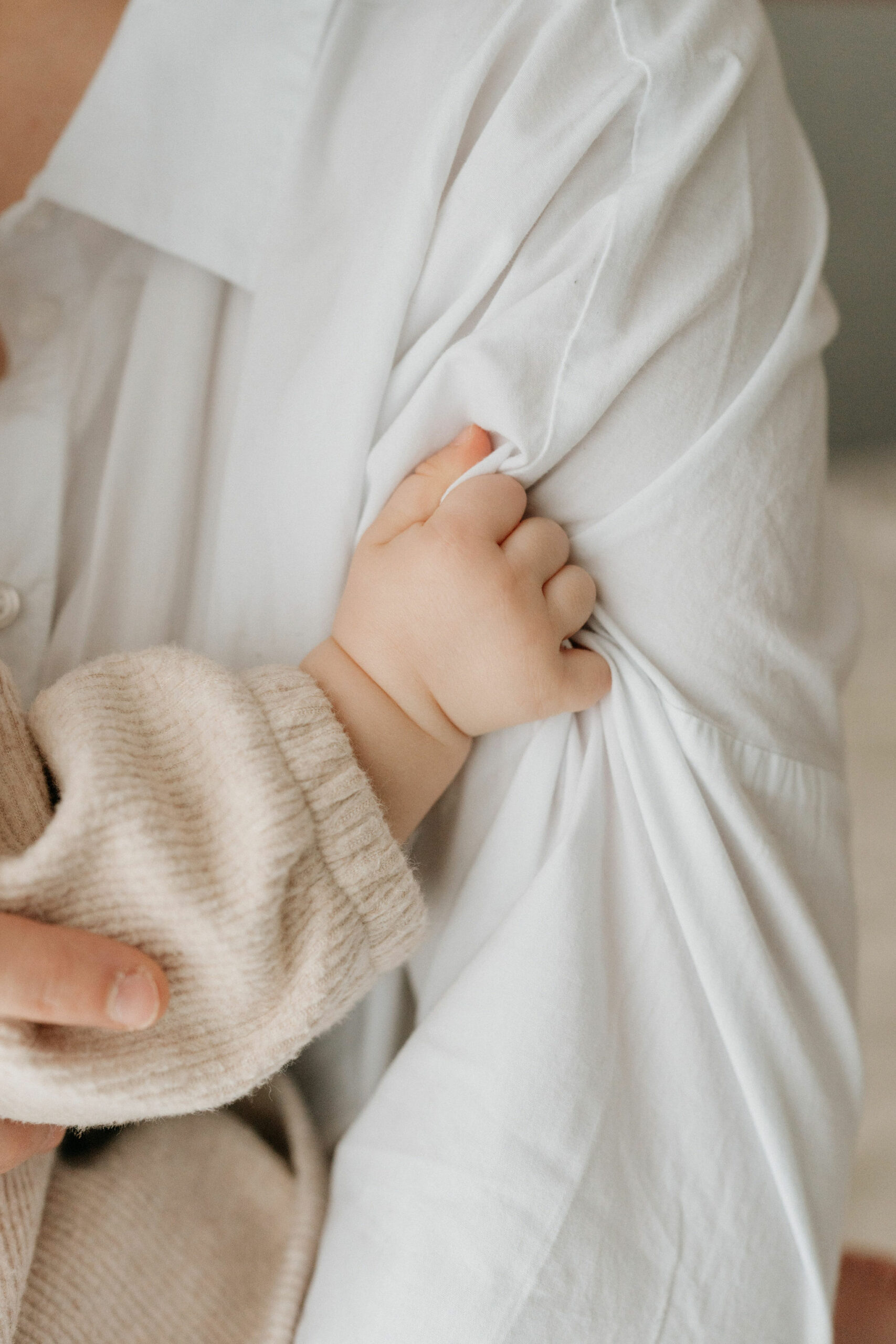 Détail intime des mains entrelacées d’un parent et son enfant lors d’une séance photo à Vannes