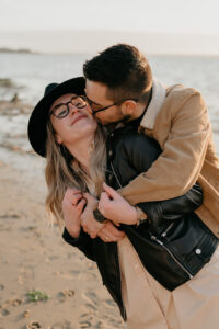 Couple profitant d’un décor marin à la pointe du Bill, sous un ciel pastel