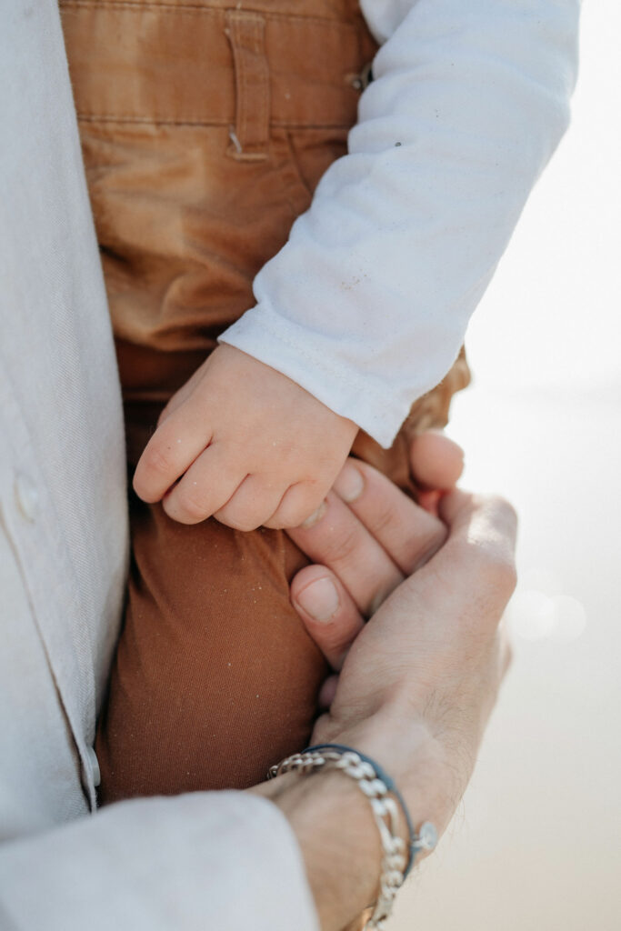 Ce soir-là, la météo était parfaite : un grand soleil, une marée basse, et une lumière de fin de journée qui baignait la plage dans des tons chauds et dorés. C’est l’un des meilleurs moments pour réaliser une séance photo famille à Vannes ou dans le Morbihan : la lumière est plus douce, plus flatteuse, et l’ambiance est plus calme.